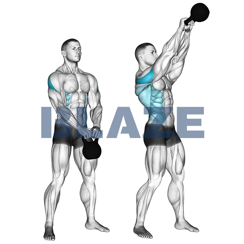 - 2Bewegung einleiten: Spanne deinen Core an. Dreh deinen Oberkörper zu einer Seite und schwing die Kettlebell auf Kopfhöhe. Nutze deine Hüften und den Core, um die Bewegung zu erzeugen.