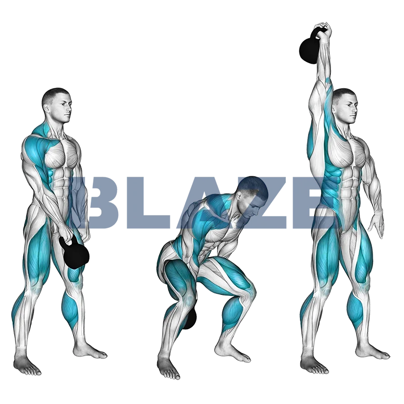 - 4Rotation et Push : Quand le kettlebell atteint la hauteur des épaules, fais pivoter ta main et pousse-le droit vers le haut en utilisant l’élan pour le stabiliser au-dessus de ta tête.