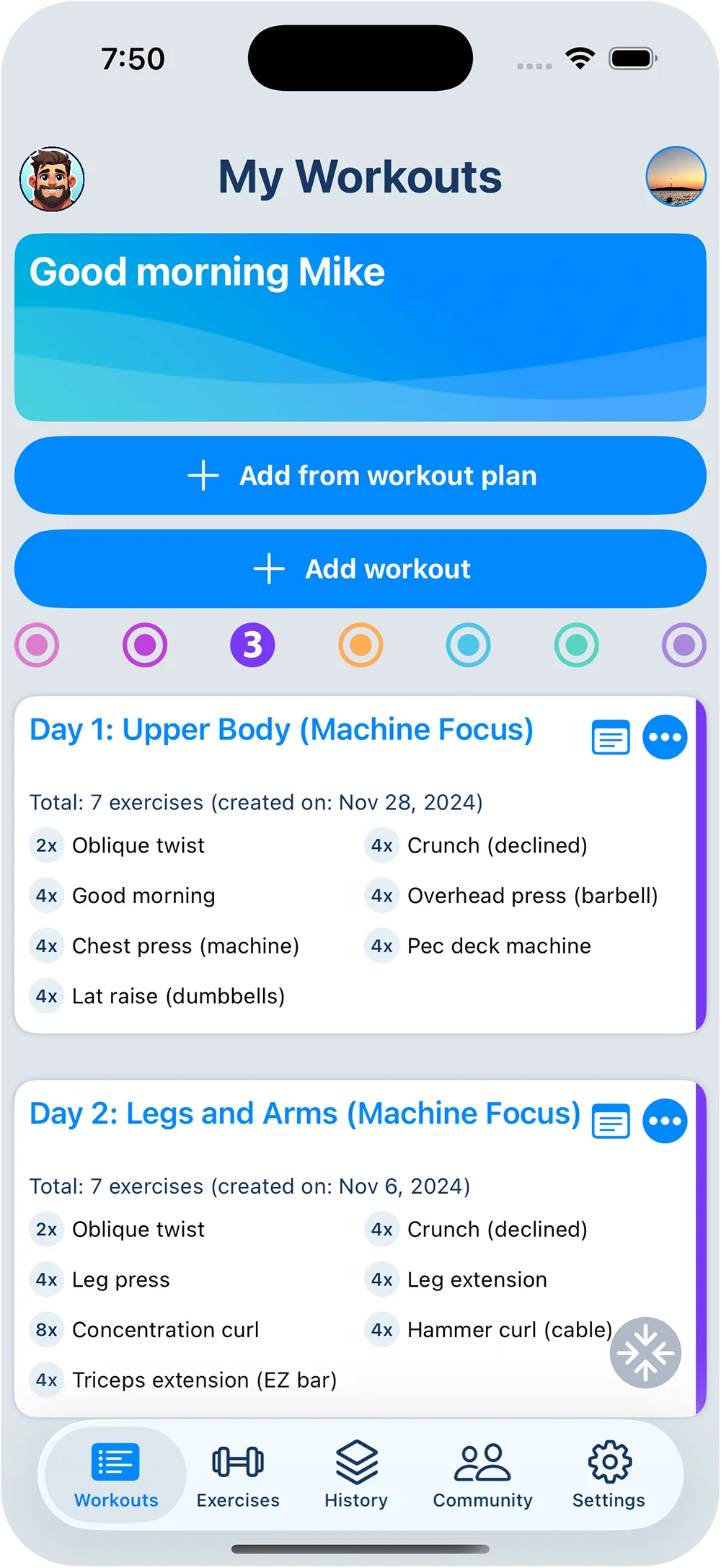 Twórz dowolną ilość spersonalizowanych planów treningowych lub wybieraj spośród dostępnych domyślnych treningów, wszystko bez dodatkowych opłat.