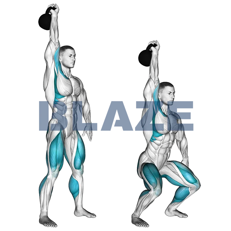 - 4Pressão Acima da Cabeça: Impulsiona pelos calcanhares, criando momentum como se fosses saltar, e pressiona o kettlebell acima da cabeça até o bloqueio.